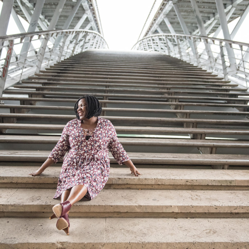 Marie porte la robe « aime comme Masala » en coton « rosier romantique marine » et la veste « aime comme Machu Picchu » en mini B. coloris « bois blond »