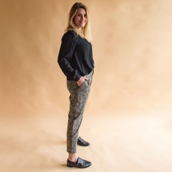 Notre pantalon Ménélas est ce qu’on peut appeler un « mid-rise » (la ceinture est au niveau des hanches), ni taille basse, ni taille haute. Sa longueur 7/8ème est celle que l’on aime car elle va aussi bien avec des boots qu’avec notre paire nos baskets favorite. Poches italiennes et plis piqués sur le devant. C’est dans la ceinture large aux découpes arrondies que Ménélas puise tout son pouvoir mythologique. Jean, jacquard, double gaze, en tencel et pourquoi pas en wax, osez tous les tissus.