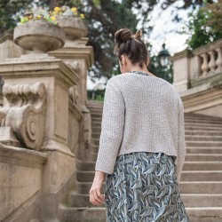 Un look qu’on aime à décrire comme bucolique, composé d’une robe longue et d’un petit gilet texturé. Les manches ¾ aux finitions élastiquées froufroutantes apportent une touche printanière bienvenue et sa ceinture à nouer confère une très belle silhouette structurée. Le point texturé est aussi beau sur l’endroit que sur l’envers du gilet.